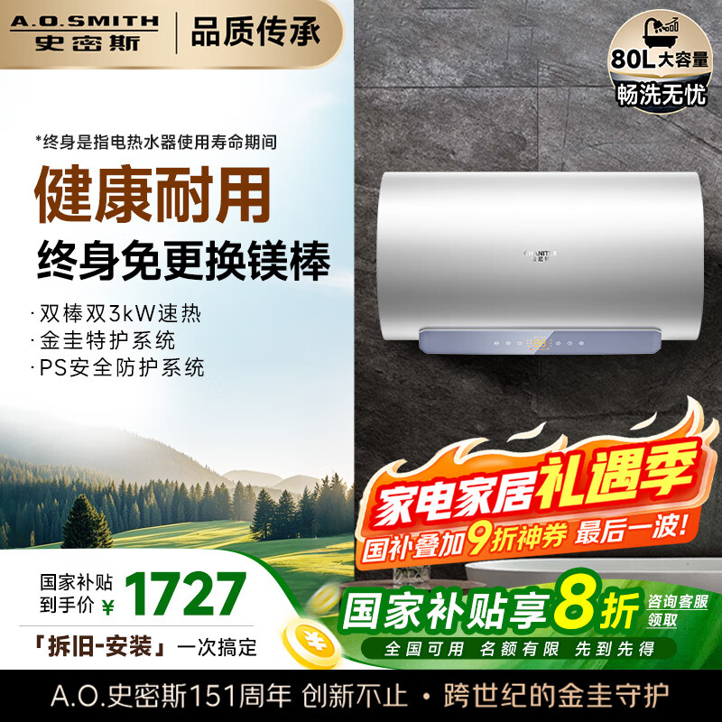 史密斯(A.O.SMITH)佳尼特80升国家补贴电热水器 金圭内胆包8年 双棒分离速热 免更换镁棒 CTE-80JC1