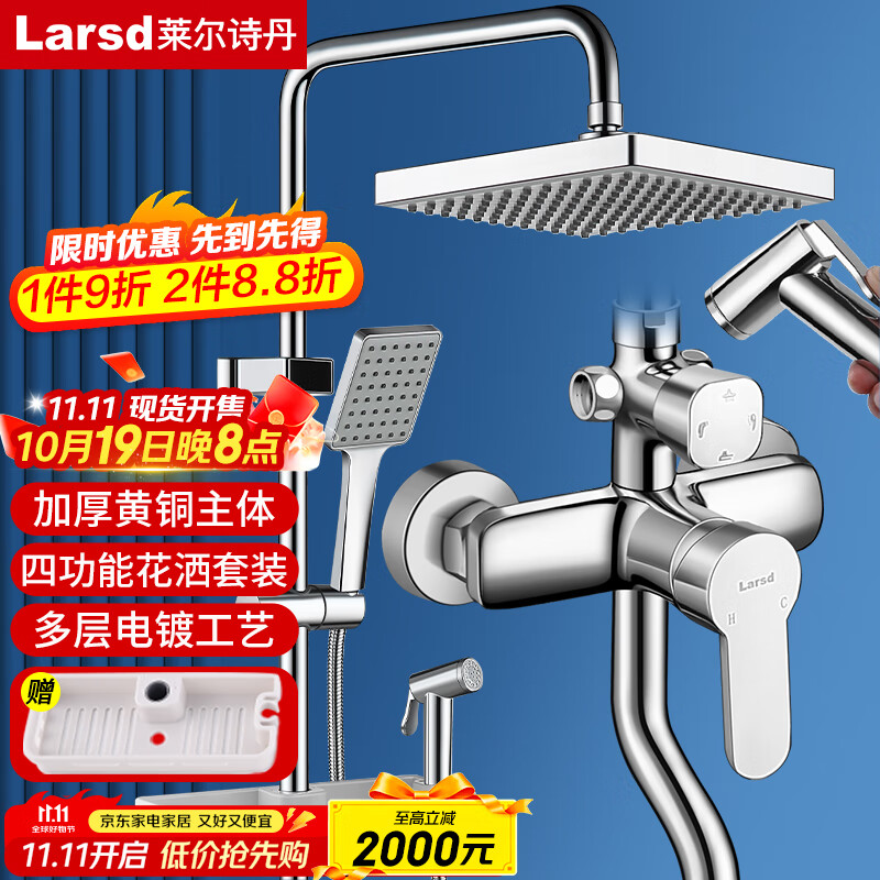 莱尔诗丹(Larsd)淋浴花洒套装 方形喷枪花洒银色 全铜主体龙头增压花洒全套 F816