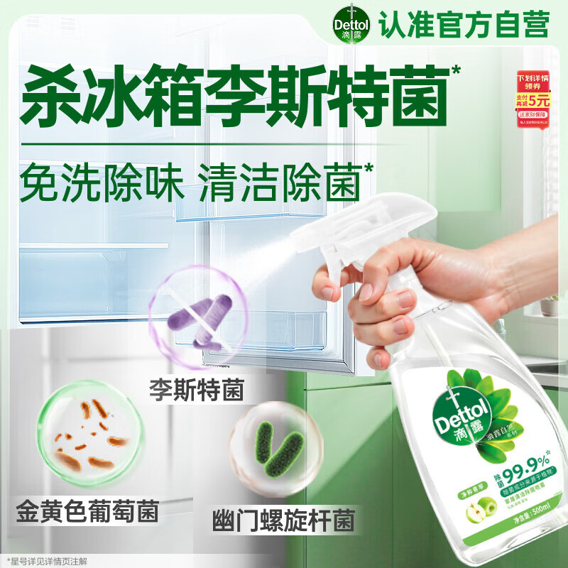 滴露(Dettol)家居厨房清洁除菌喷雾500ml冰箱清洁剂除味消毒李斯特菌 免水洗