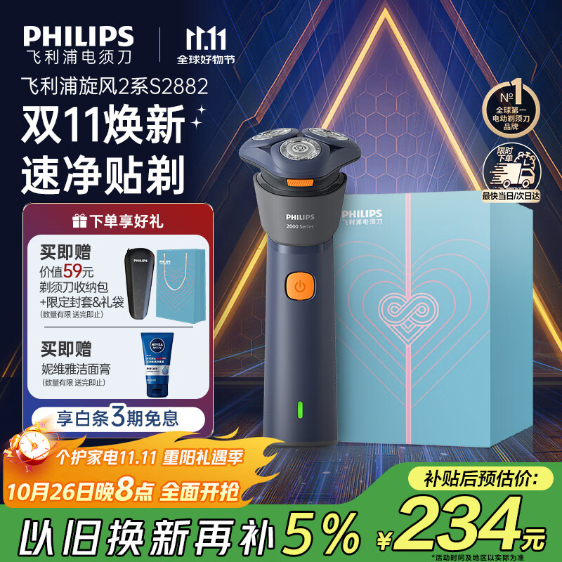 飞利浦(PHILIPS)电动剃须刀新一代旋风2系刮胡刀导须净剃6D自贴合刀头 送男友送老公 父亲生日礼物