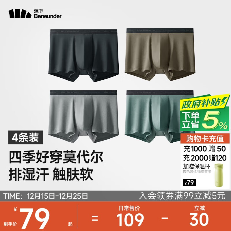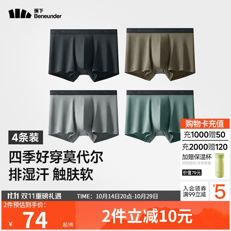 蕉下莫代尔内裤男士运动内裤裤衩四角平角裤无痕裸感透气款四季