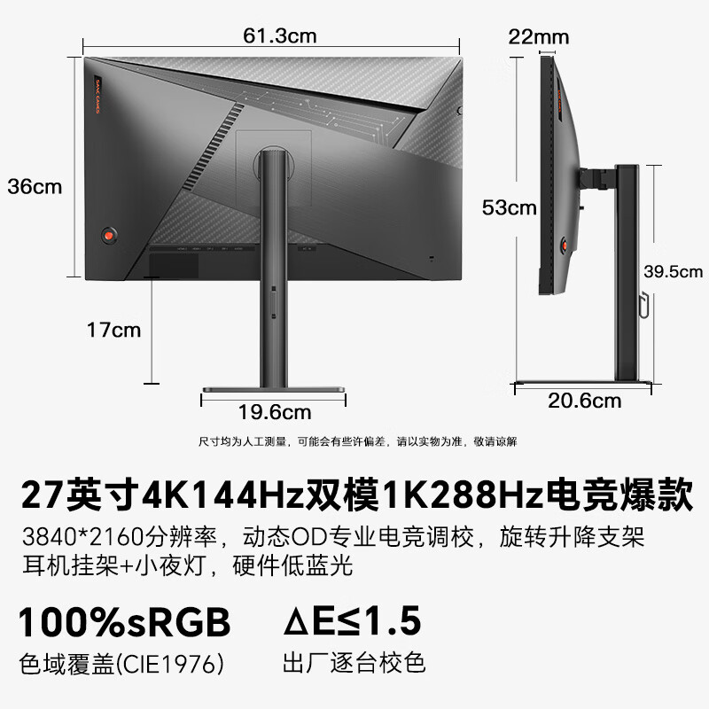 SANC盛色27英寸4K144Hz双模1K288Hz硬件低蓝光IPS HDR400亮度 旋转升降 电脑显示器电竞屏幕 G7u
