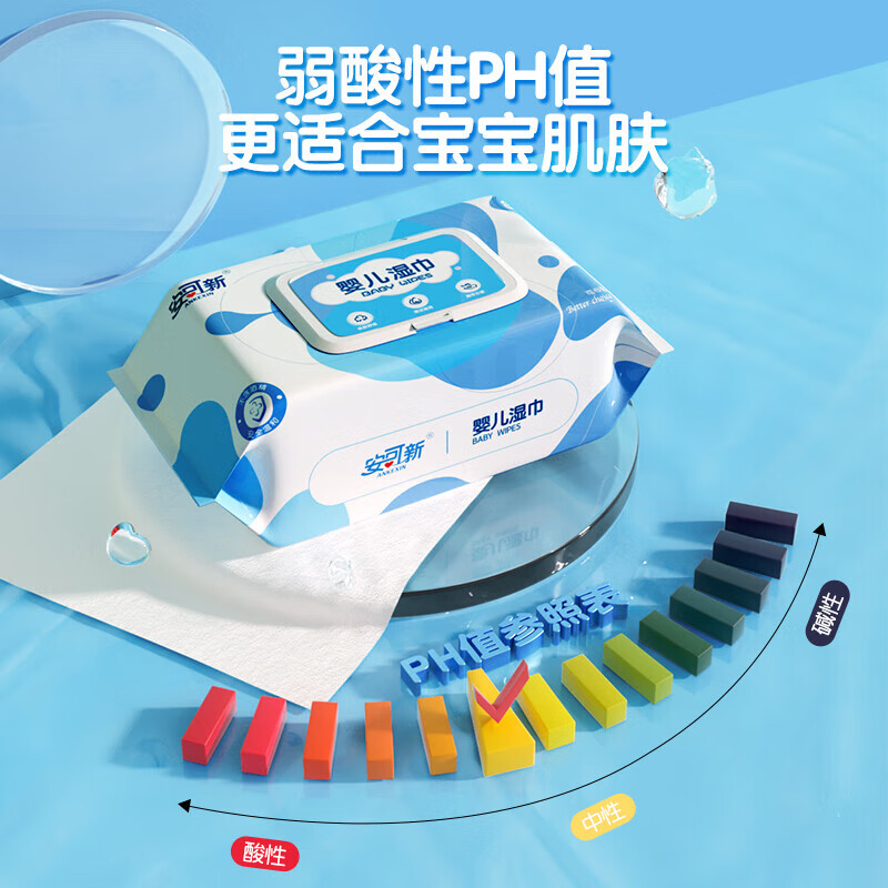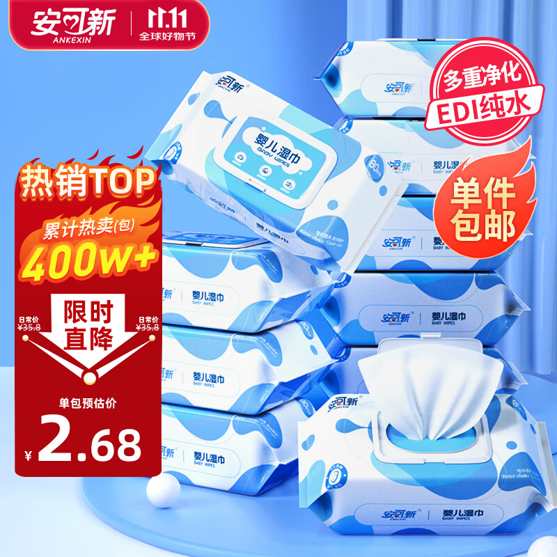 安可新 婴儿湿巾【80抽*10包】一次性手口湿纸巾宝宝柔湿巾纯水带盖