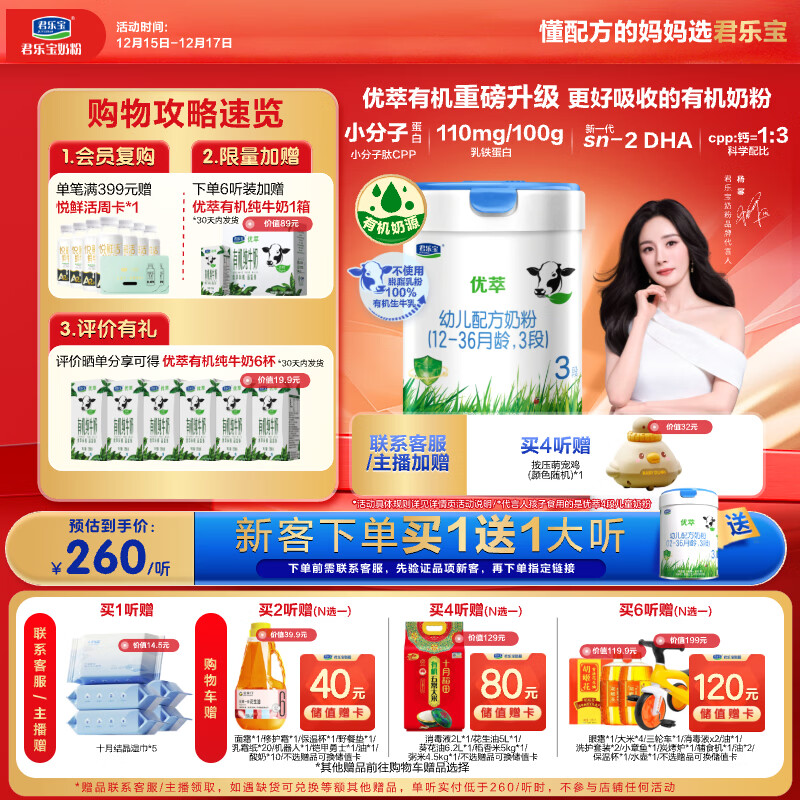 君乐宝(JUNLEBAO)有机优萃3段幼儿配方奶粉(12-36月龄)800g听装新旧随机发货