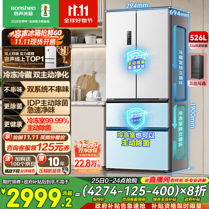 容声526升双净双系统法式多门四开门电冰箱家用一级能效风冷无霜节能大容量BCD-526WD1MPA白国家补贴