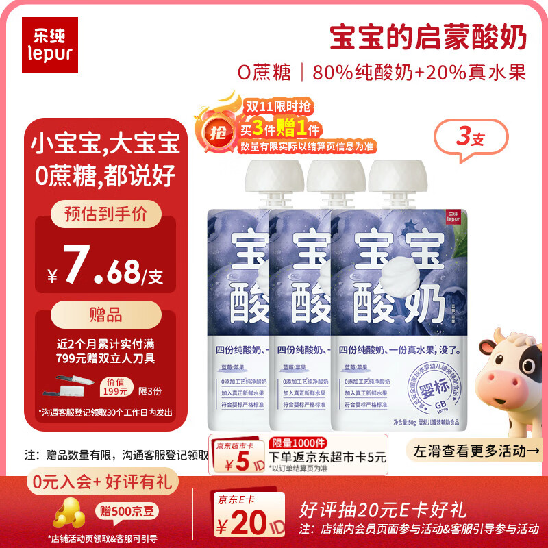 乐纯婴标宝宝酸奶蓝莓50g*3支 常温辅食0添加0蔗糖儿童零食(6个月+)
