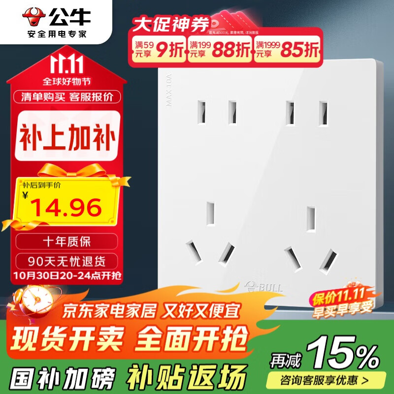 公牛(BULL)开关插座 G12系列 十孔插座86型插座面板 G12Z423 象牙白