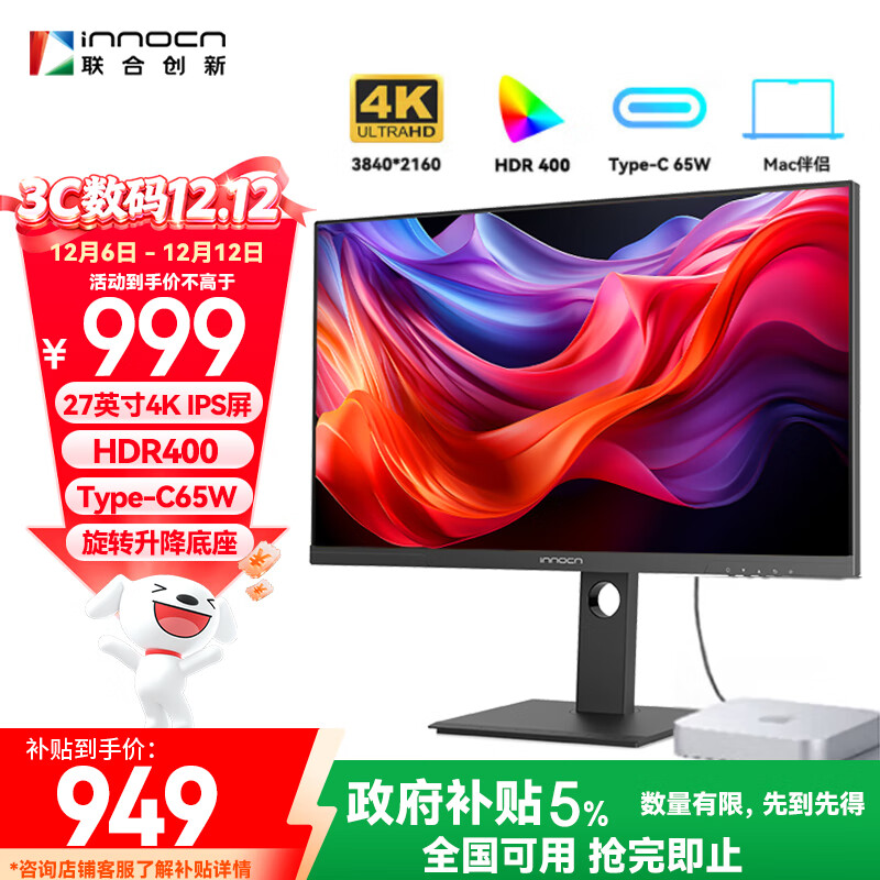 联合创新27英寸显示器4K超清IPS技术 98%P3色域HDR400 Type-C65W旋转升降 电脑办公显示屏27D1U