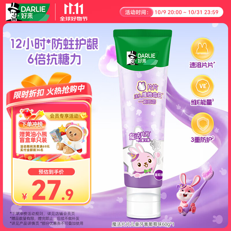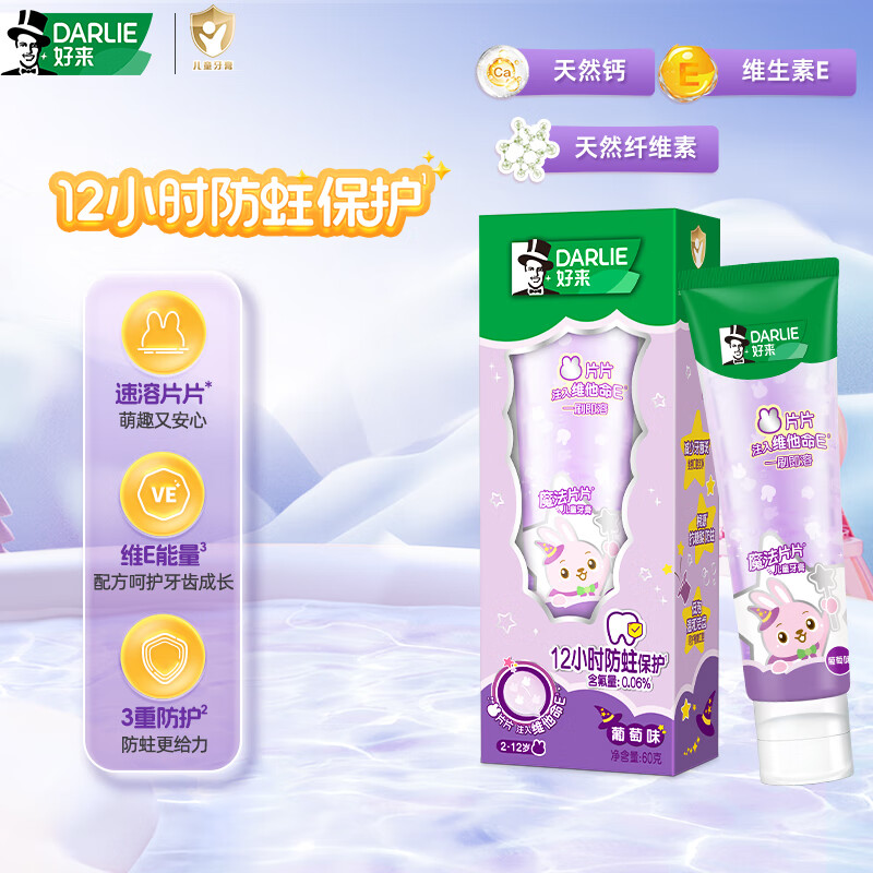 DARLIE好来(原黑人)魔法片片儿童牙膏2-3-6-12岁葡萄味60g 含氟防蛀抗糖