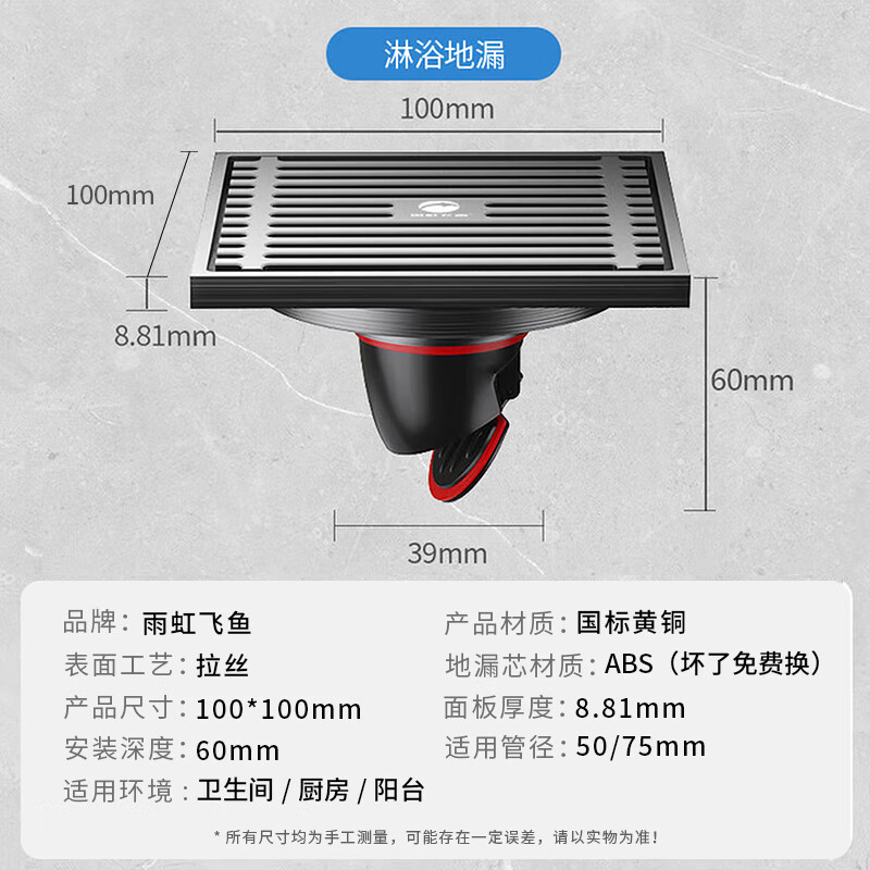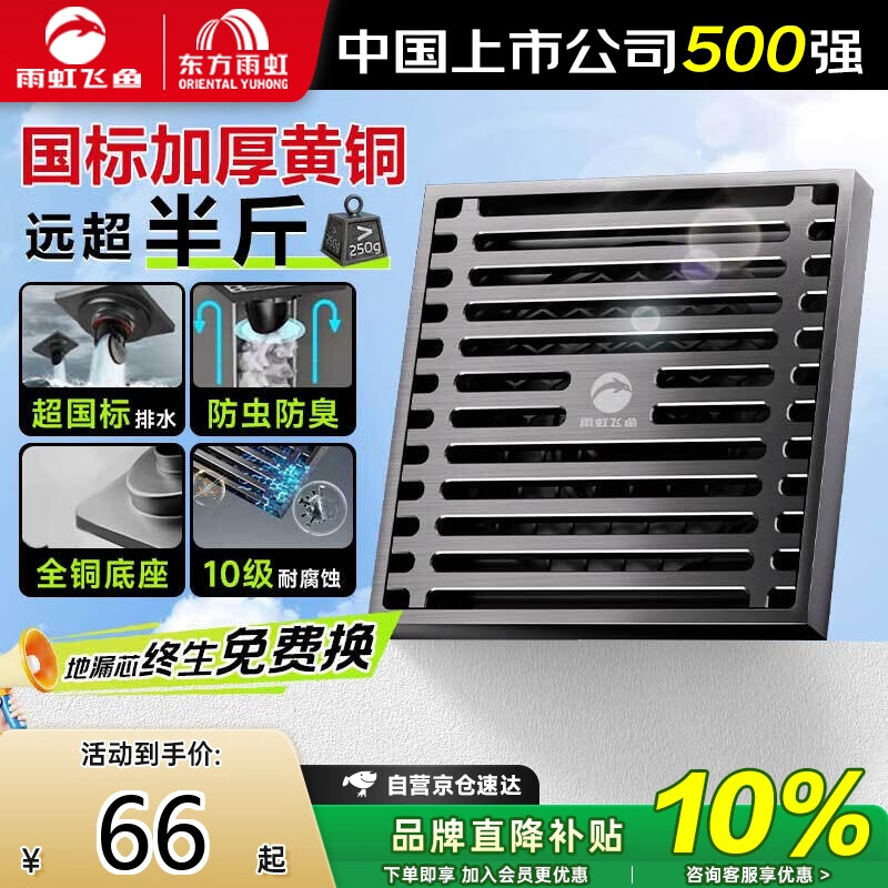 雨虹飞鱼东方雨虹全铜地漏枪灰防反水防臭地漏卫生间大排量下水道淋浴地漏
