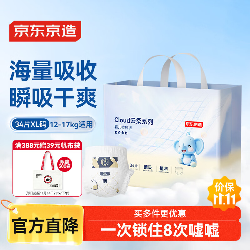 京东京造婴儿拉拉裤尿不湿纸尿裤Cloud云柔XL34片(12-17kg)超薄透气