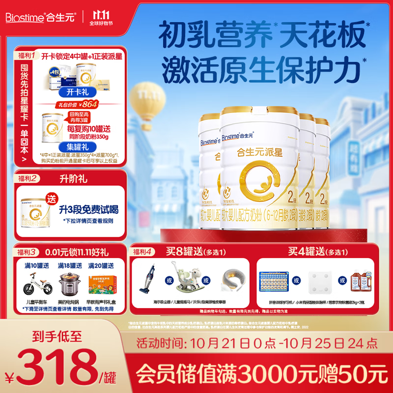 合生元(BIOSTIME)派星 较大婴儿配方奶粉2段(6-12个月)新国标 800g*4罐