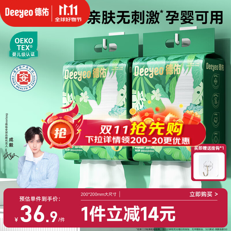 德佑洗脸巾160抽*2提壁挂式加大加厚干湿两用一次性棉柔洁面绵柔巾