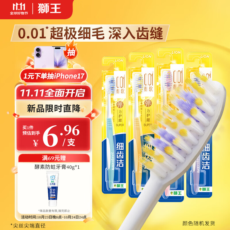 狮王(Lion)细齿洁0.01弹力护龈牙刷4支软毛深入清洁弹力刷柄成人家庭装