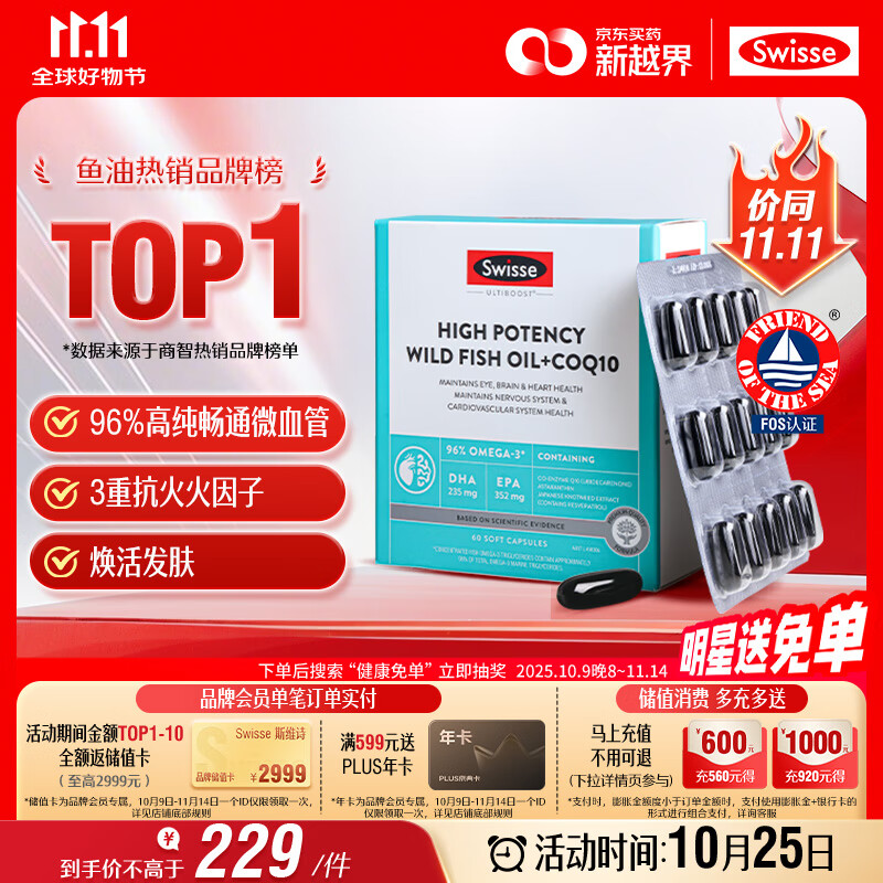 Swisse斯维诗 96%高纯度深海鱼油辅酶Q10软胶囊 黑绷带鱼油60粒 Omega-3
