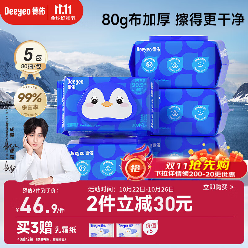 德佑湿厕纸经典款80抽*5包家庭装洁厕湿巾纸擦屁屁专用加厚亲肤可冲散
