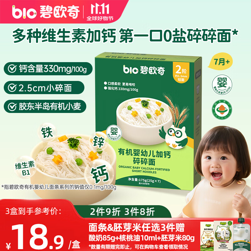 碧欧奇有机婴幼儿加钙碎碎面175g 宝宝婴儿面条6-12个月碎碎面钙铁锌