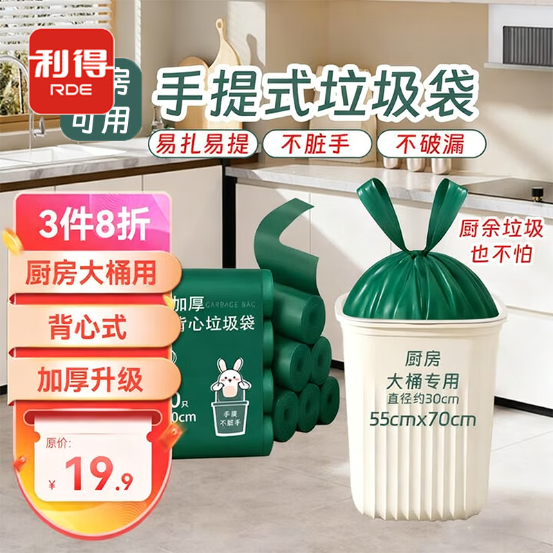利得背心垃圾袋松绿青55*70cm100只单面1丝家用厨房加厚手提垃圾袋