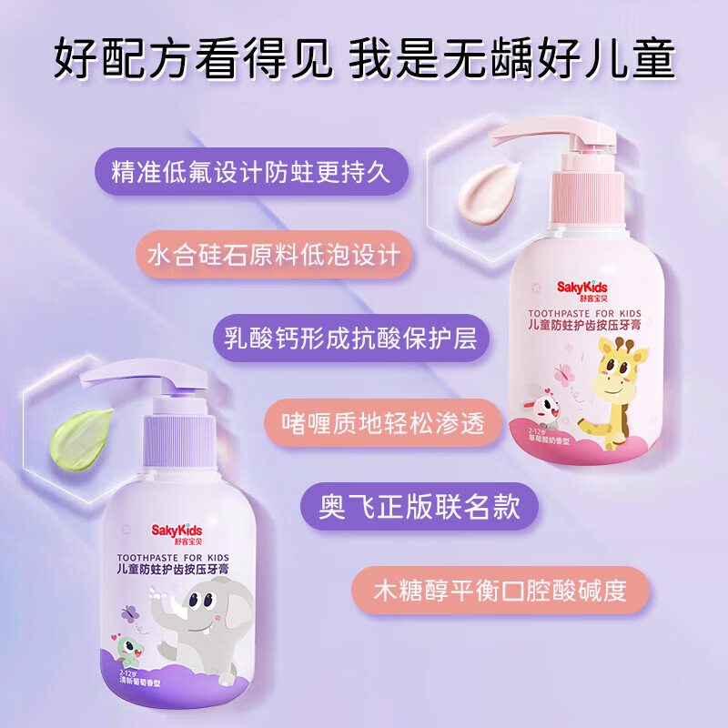 舒客宝贝儿童牙膏按压式150g大容量含氟防蛀2-12岁葡萄味+草莓味2瓶装