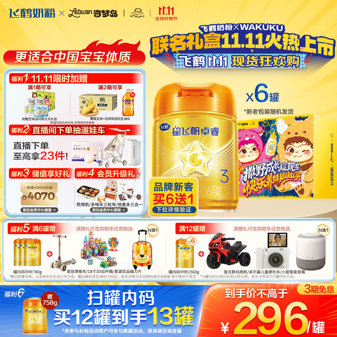 飞鹤星飞帆卓睿Pro A2β酪蛋白3段(1-3岁)幼儿配方奶粉758g*6老爸抽检
