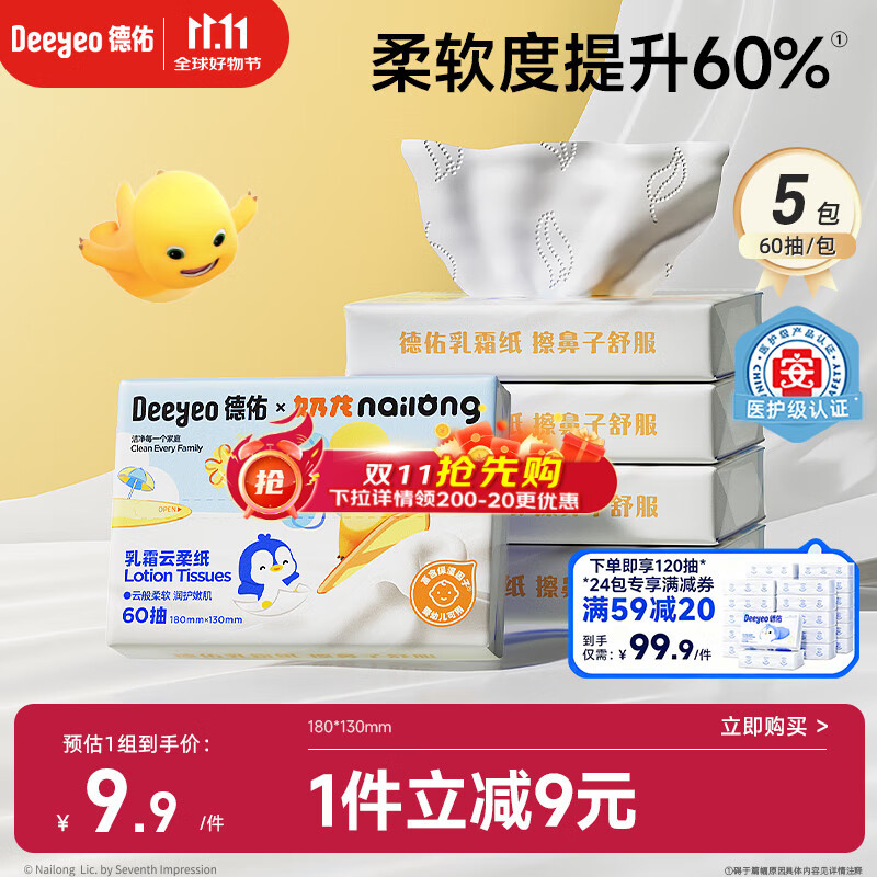 德佑婴儿云柔巾保湿纸巾乳霜纸60抽5包儿童超柔软抽纸奶龙款