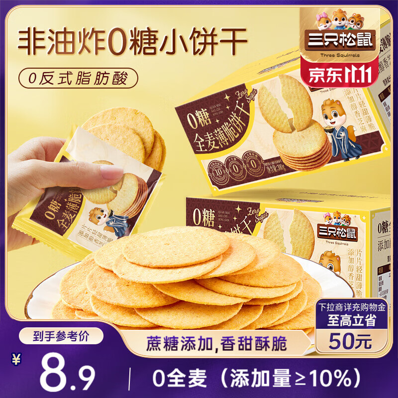 三只松鼠0糖全麦薄脆饼干300g盒装非油炸办公室代餐健康小包装零食点心
