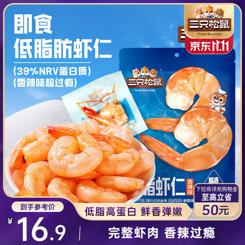 三只松鼠即食低脂虾仁50g 香辣味独立小袋减脂健身高蛋白海鲜零食