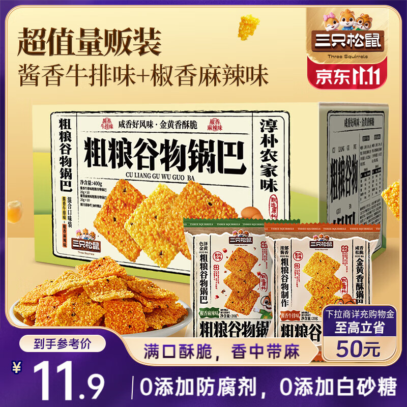 三只松鼠粗粮谷物锅巴300g混合口味箱装椒香麻辣酱香牛排膨化零食解馋