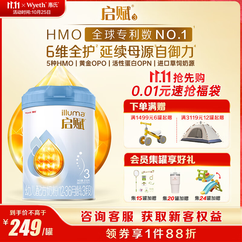 惠氏(Wyeth)启赋蓝钻HMO幼儿配方奶粉3段(12-36月)810g