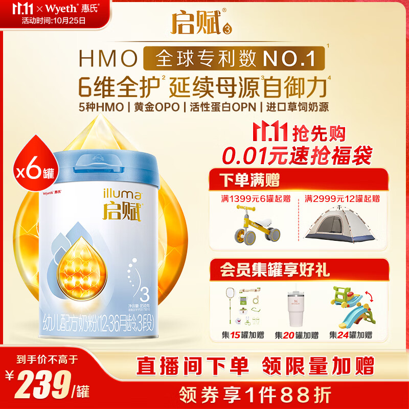 惠氏(Wyeth)启赋蓝钻【加量装】HMO幼儿配方奶粉3段(12-36月)850g*6罐