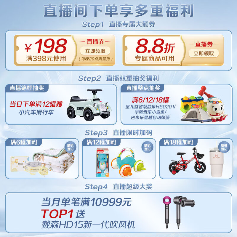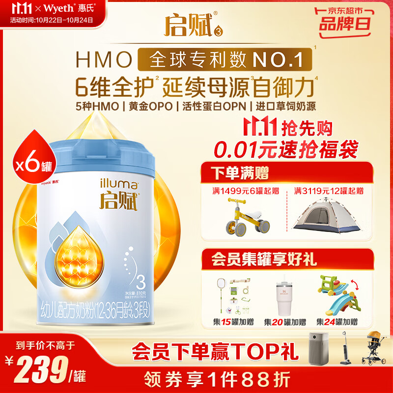 惠氏(Wyeth)启赋蓝钻HMO幼儿配方奶粉3段(12-36月)810g*6罐