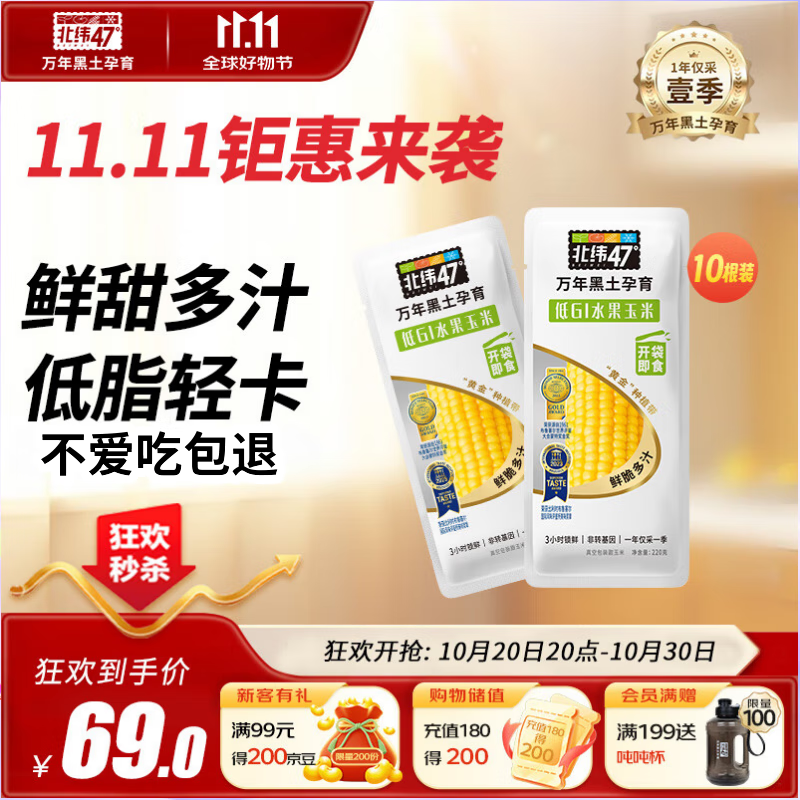 北纬47°水果玉米4斤(约220g*10根) 开袋即食鲜甜玉米棒真空包装 低脂低GI