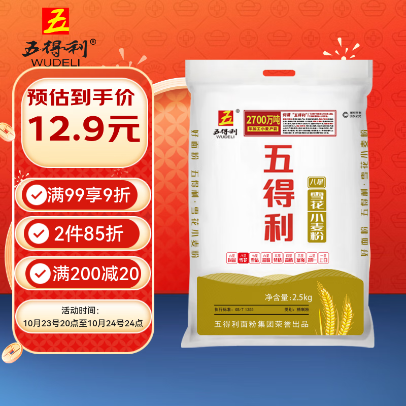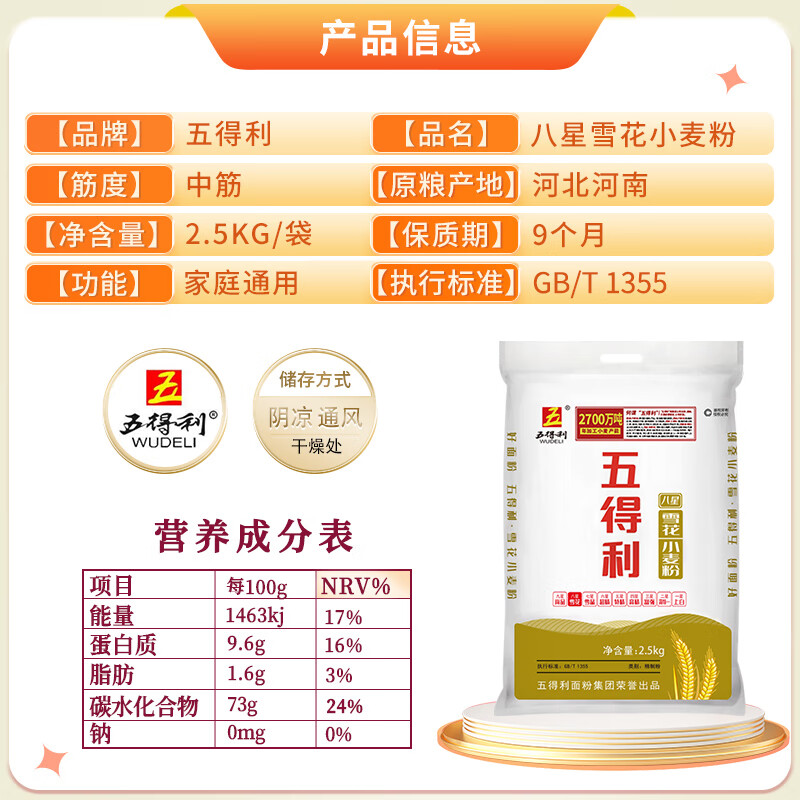 五得利面粉 八星雪花小麦粉包子面条水饺麦芯粉5斤