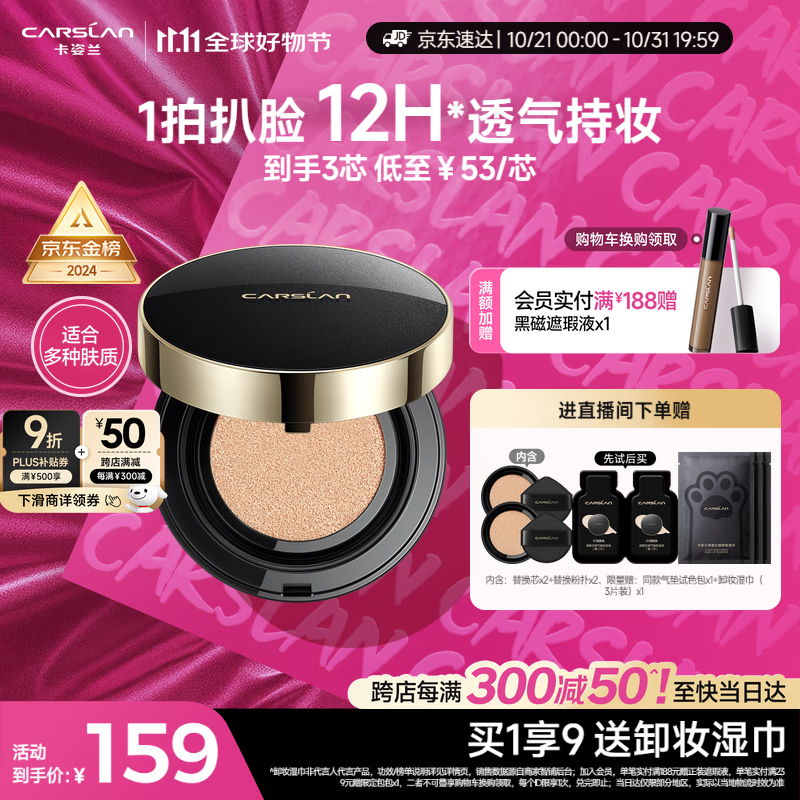 卡姿兰(Carslan)黑金气垫BB霜2.0遮瑕控油保湿不脱粉底液02柔肤色14.5g*3生日礼物
