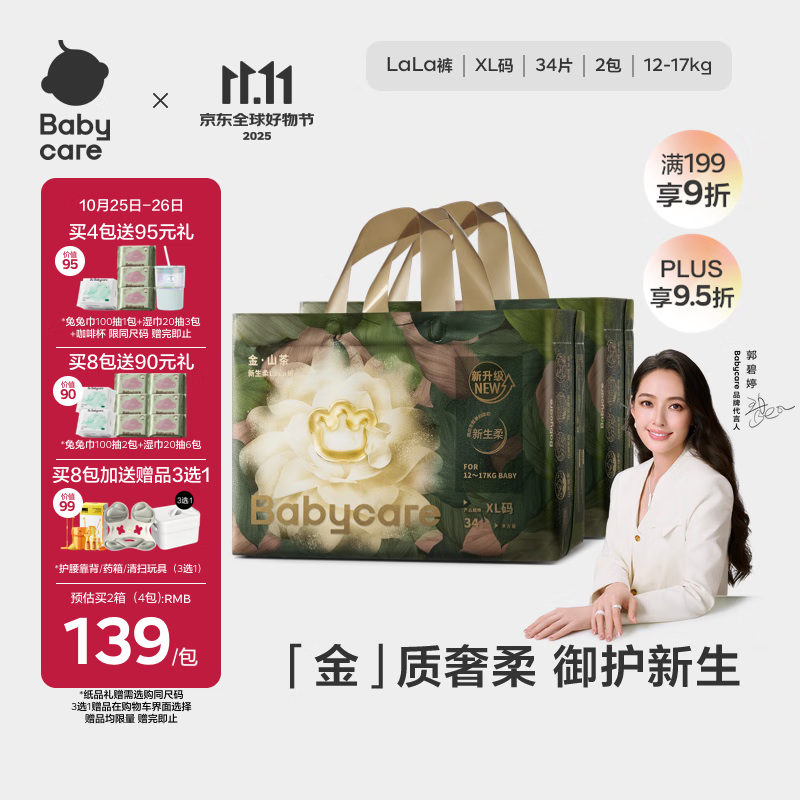 babycare金山茶花拉拉裤XL34片*2包(12-17kg)婴儿尿不湿超薄透气花苞裤