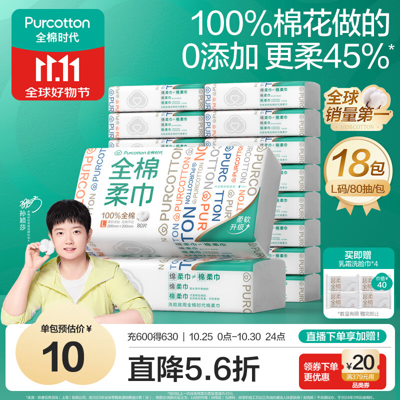 全棉时代【孙颖莎同款】洗脸巾 80片*18包100%棉柔毛巾一次性整箱20*20CM
