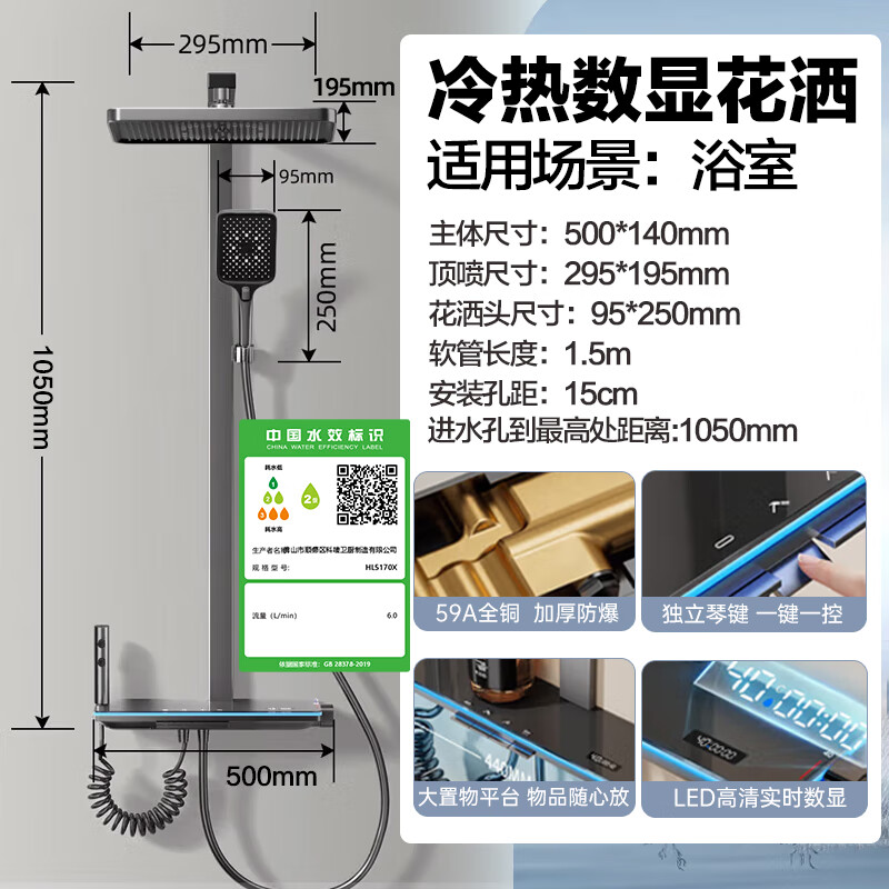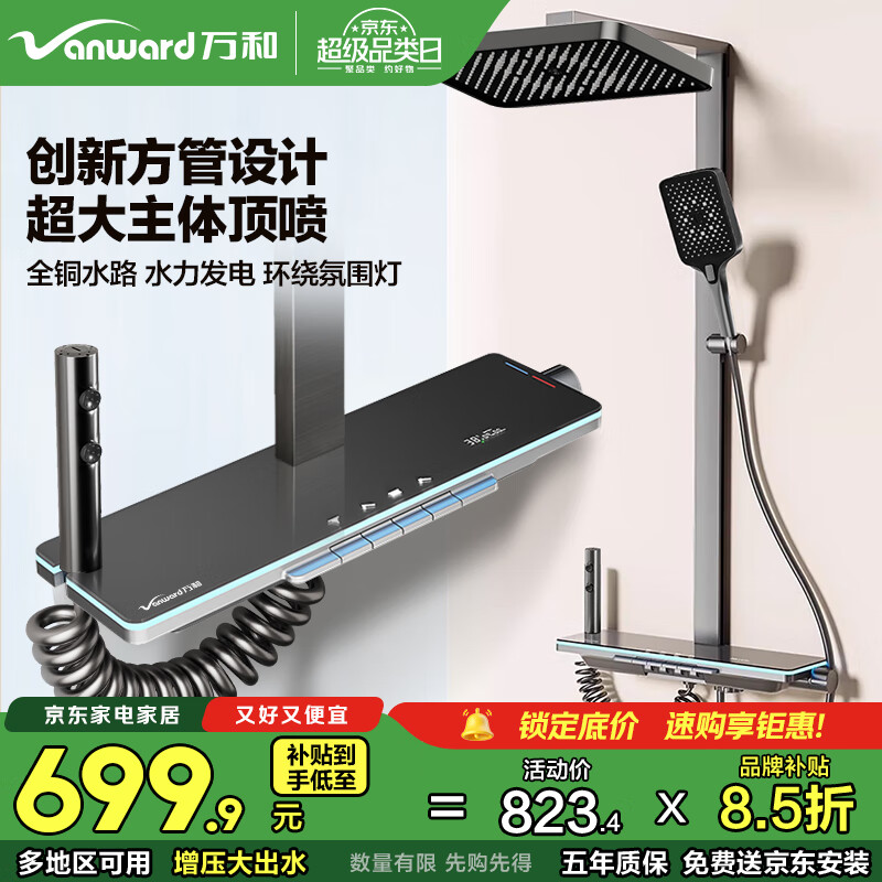 万和(Vanward)淋浴花洒套装数显花洒全套增压花洒枪灰淋浴器全铜方管贴墙7073Q