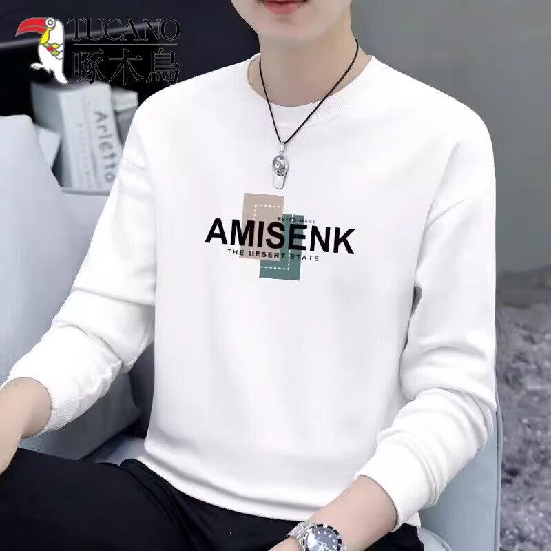 啄木鸟【纯棉】卫衣春秋款纯棉圆领长袖T恤时尚新款潮流秋冬季加厚加绒 白色+浅灰春秋款 超惠两件装 M 建议【90-105斤】