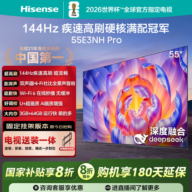 海信电视55E3NH Pro 55英寸【送装一体-固定挂架】144Hz高刷 杜比全景声 智能Wi-Fi6 U+超画质大内存