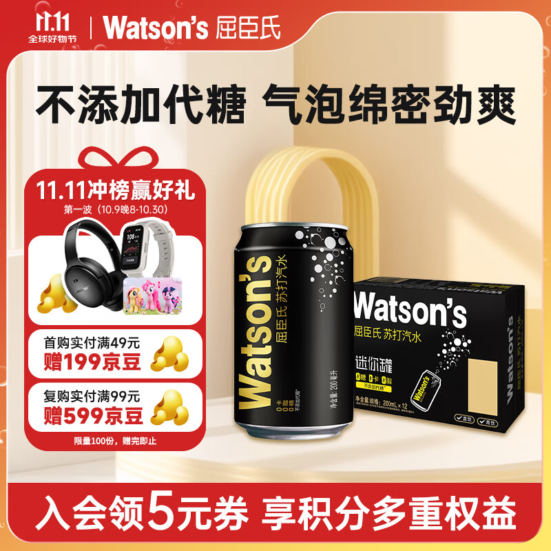 屈臣氏(Watsons)苏打汽水原味mini罐迷你0糖0卡0脂200mL*30罐整箱便携装