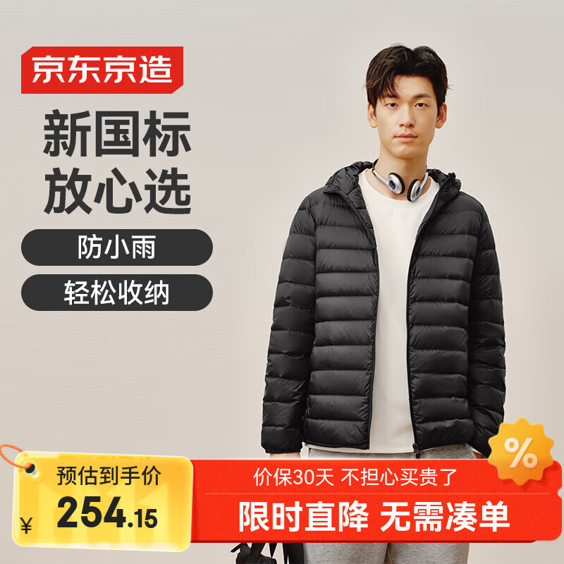 京东京造【air+零压羽绒】轻薄羽绒服男外套冬连帽白鸭绒 曜石黑M