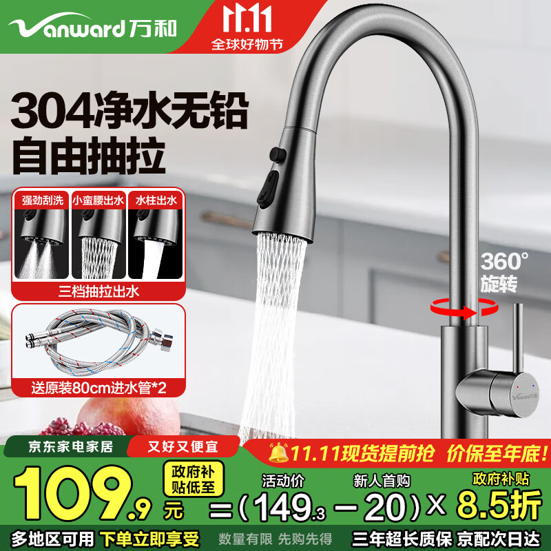 万和厨房水龙头洗菜盆冷热抽拉式水龙头304不锈钢洗碗盆水槽龙头C03Q