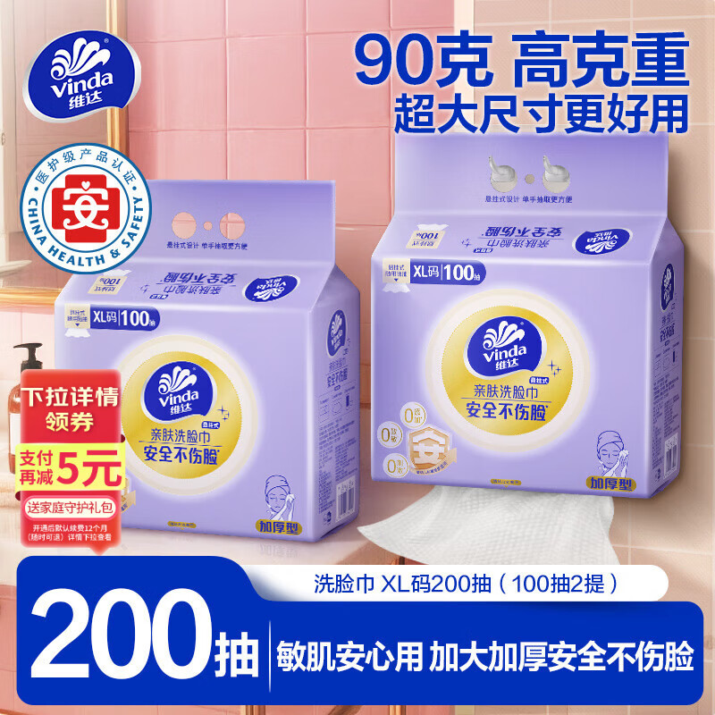 维达(Vinda)洗脸巾 100抽*2提XL码 一次性毛巾洗脸巾 90克高克重悬挂式整箱