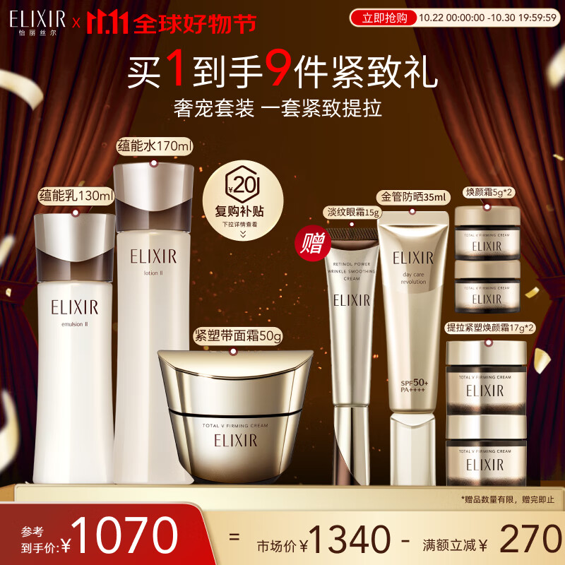 怡丽丝尔(ELIXIR)黑金水乳紧塑带面霜护肤品套装4周紧致保湿乳液礼物