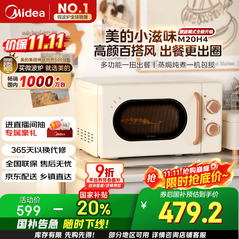 美的【国家补贴8折】厨房小家电小滋味微波炉变频家用小型百搭复古转盘式经典双旋钮轻音M20H4