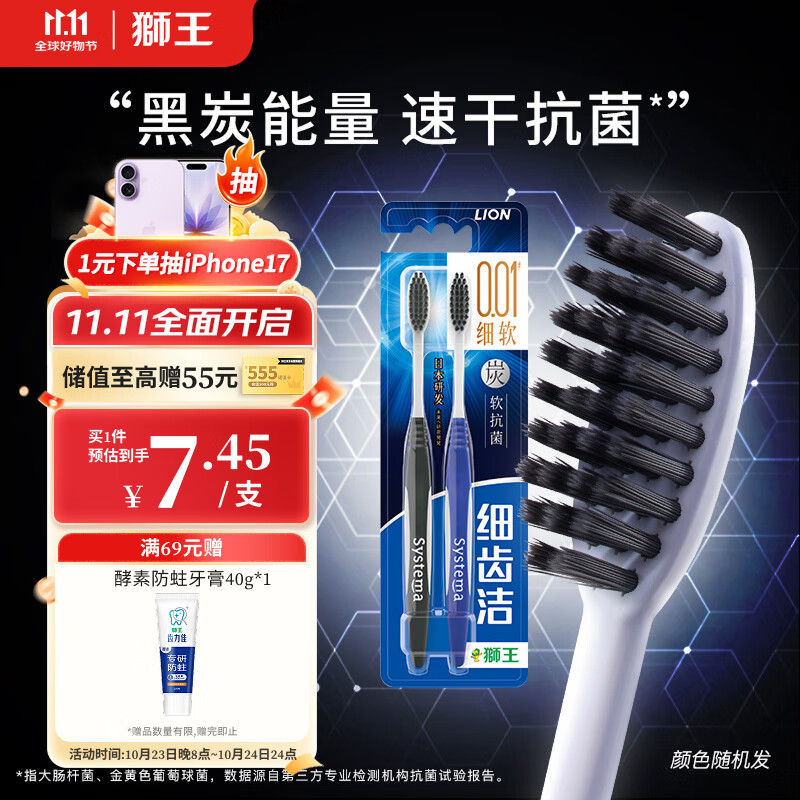 狮王(Lion)细齿洁0.01炭能量护龈牙刷2支软毛 颜色随机发货