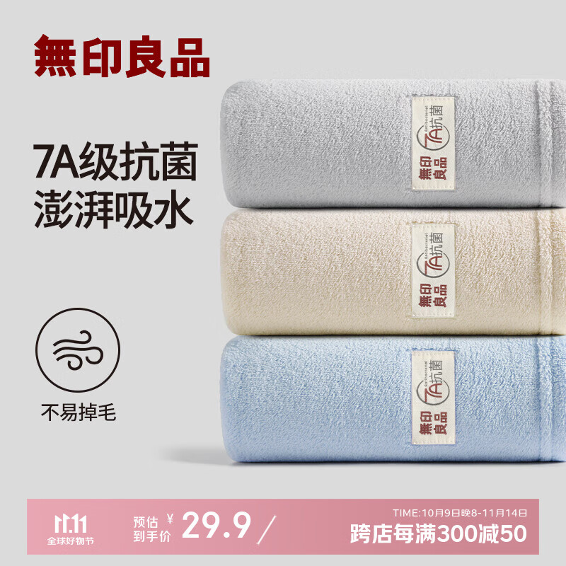 无印良品毛巾7A级抗菌3条装加厚柔软强力吸水不易掉毛A类洗脸洗澡大面巾