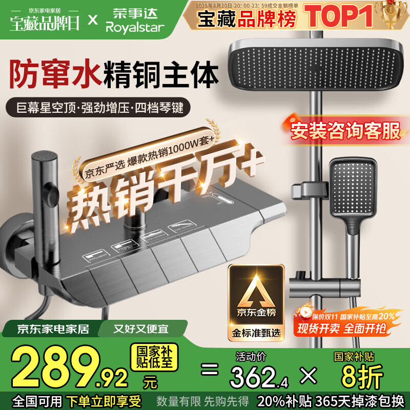 荣事达淋浴花洒套装精铜智能花洒全套家用卫浴室增压淋浴器国补枪灰qx
