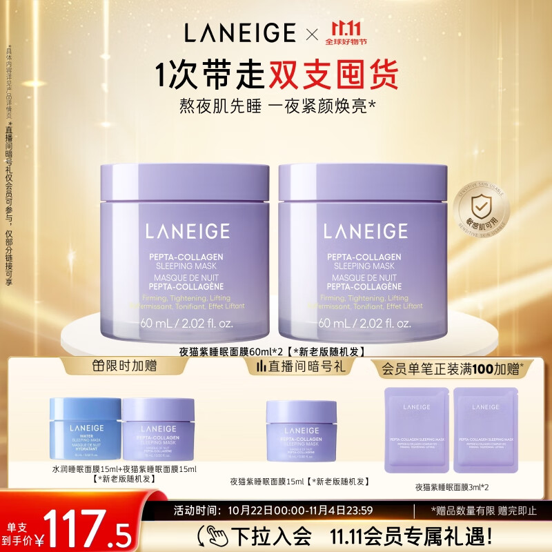 兰芝夜猫紫胶原多肽紧颜睡眠面膜双支抗氧焕亮保湿60ml生日礼物女