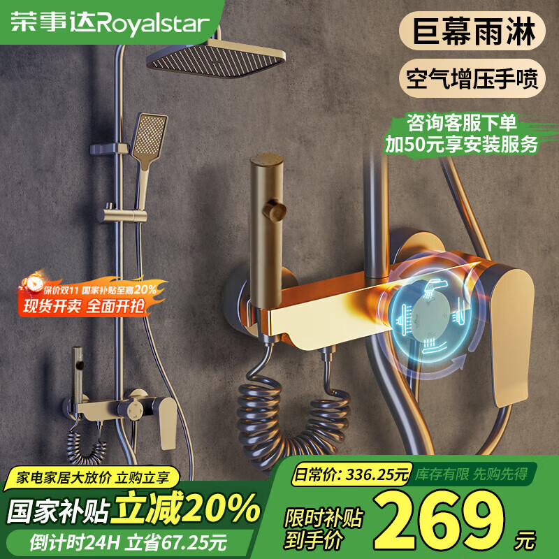 荣事达淋浴花洒套装精铜龙头卫浴室喷头全套增压沐浴器家用金榜枪灰qx